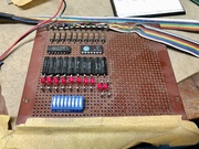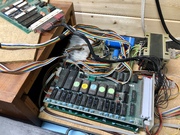 There's also a blinkenlights panel connected to a serial port and 2 more ports taking up the EPROM burner you can see in the pix - 3 9V batteries required! Finally there's a choice of either the original Tangerine hex keypad or a nicely cased 'real' keyboard that's been nicked from an original Bell&Howell Apple ][....